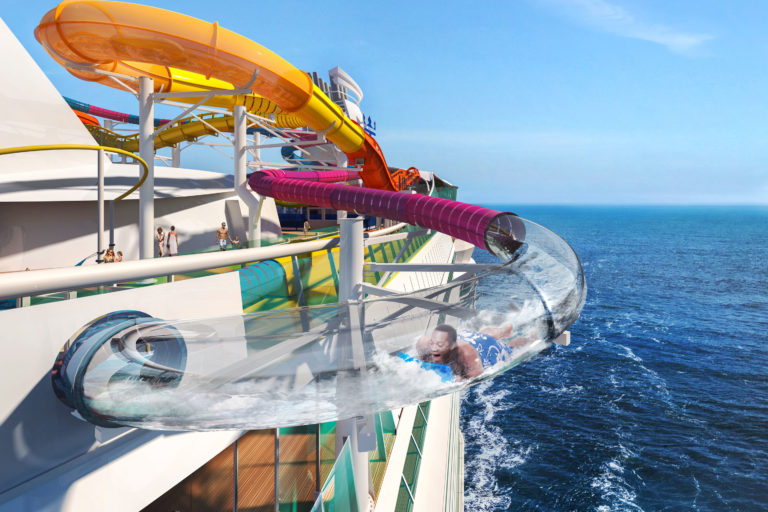 Вас унесёт вниз единственная в море водная горка для спуска головой вперёд. Самое захватывающее приключение — это пролететь через полупрозрачную трубу над бортом корабля, откуда открывается захватывающий вид на океан.